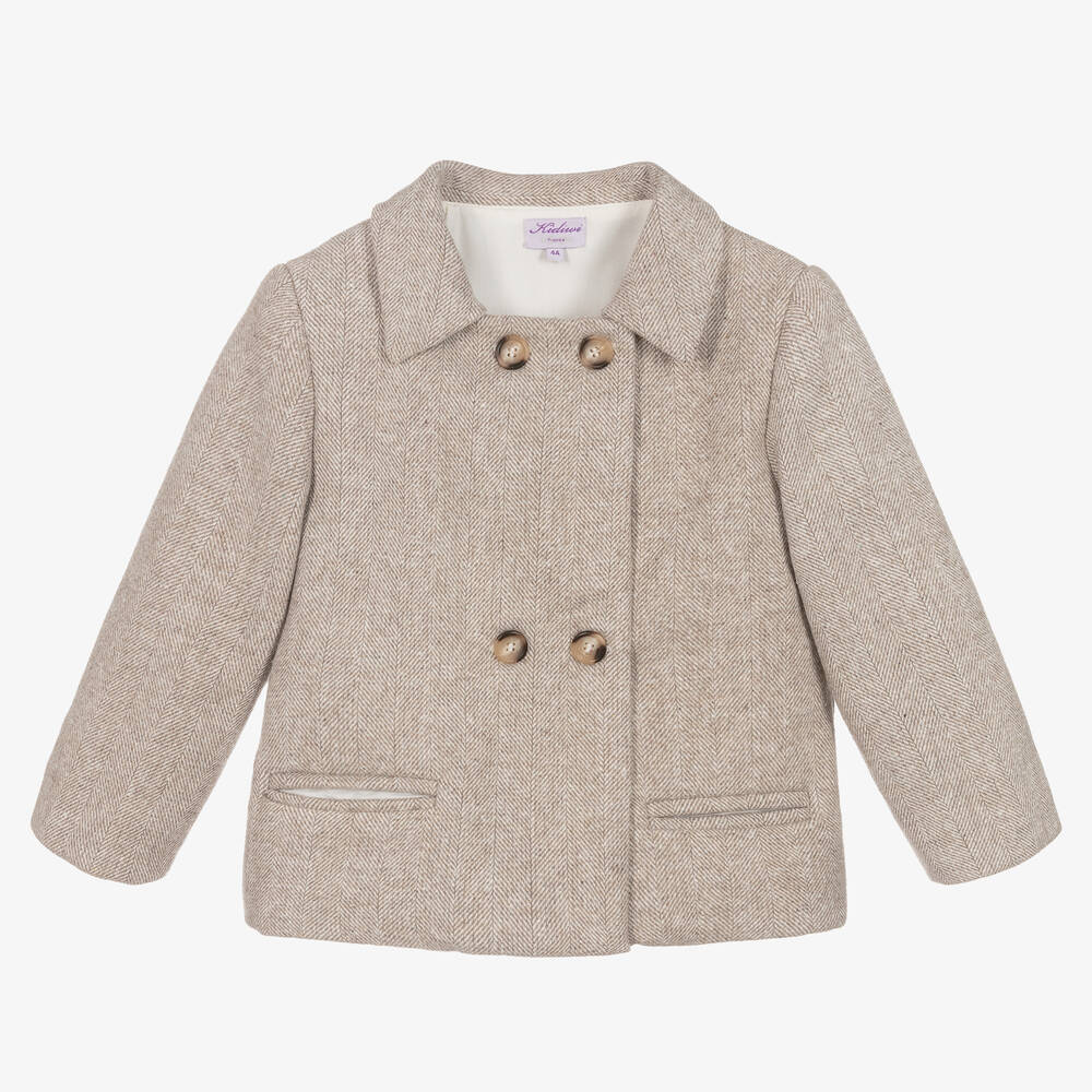 Classic beige double-breasted jacket for boys and girls by Kidiwi, made from a soft wool-blend herringbone tweed. Lined in lightweight cotton twill for a comfortable wear, it has pockets on the front, a sweet pointed collar, and faux tortoise shell button fastenings.