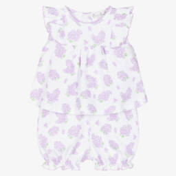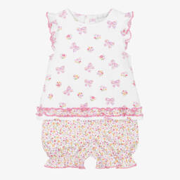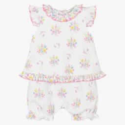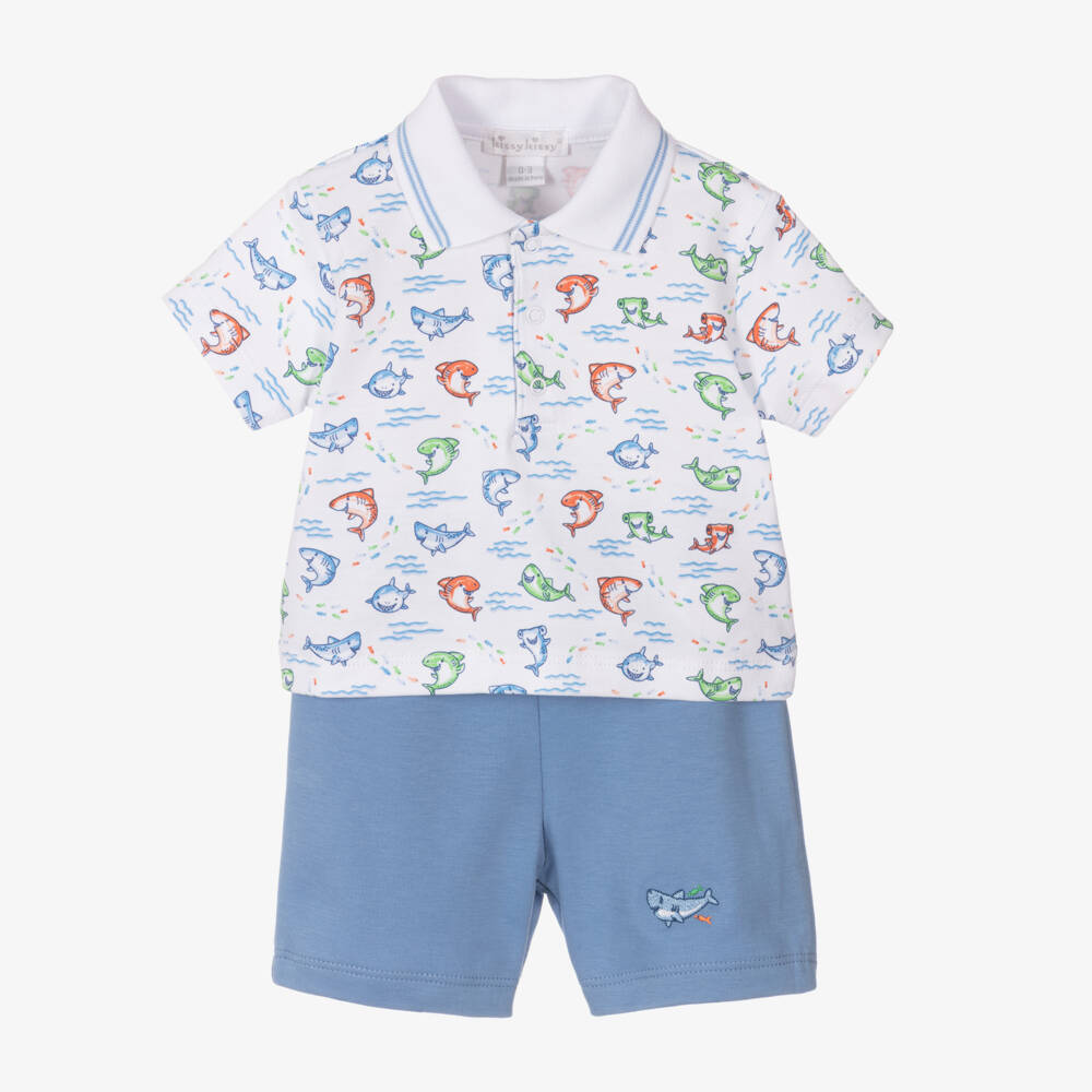 Cute white and blue shorts set for baby boys by Kissy Kissy, made in super soft Pima cotton jersey. Patterned with colourful sharks with cheeky grins, the polo shirt has easy popper fastenings. The pull-on shorts have matching embroidery and a decorative tie on the front.