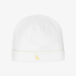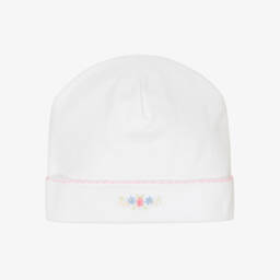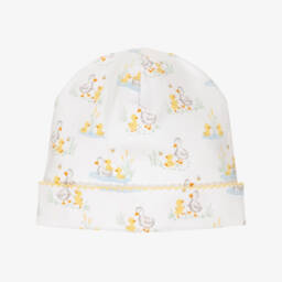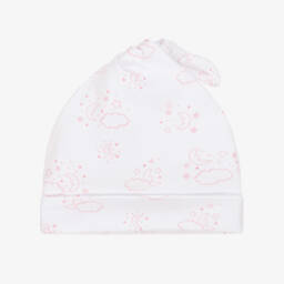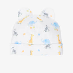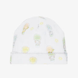 A white layette hat for baby boys by Kissy Kissy, patterned with a colourful car print. It is made in a double layer of beautifully soft Pima cotton jersey for a gentle feel against delicate skin.