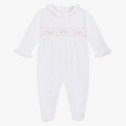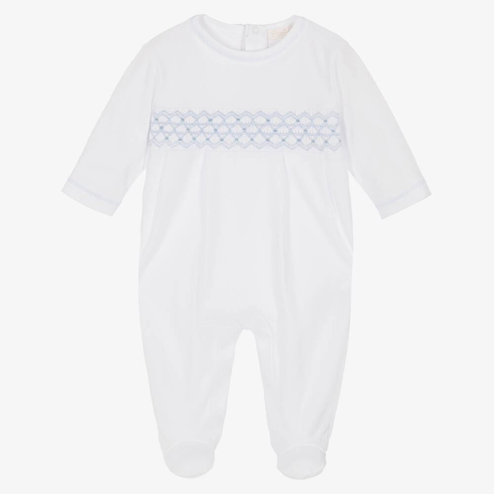 A white babygrow for boys by Kissy Kissy, made in super soft Pima cotton jersey. It has a charming hand-smocked panel with blue embroidery for a traditional look. There are popper fastenings on the back and between the legs.