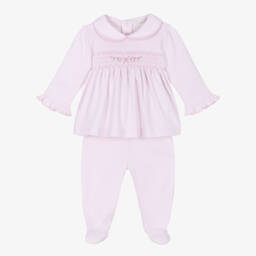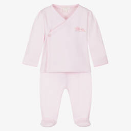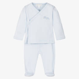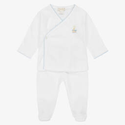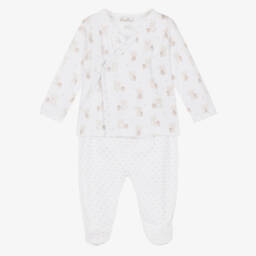 White two piece babygrow for boys and girls by Kissy Kissy, made in super soft, stretchy Pima cotton jersey. The top is patterned with cute grey sheep and has a crossover front fastening with poppers. Smaller sizes have fold-over scratch mitts. The bottoms have a lovely grey star print and an elasticated waist for comfort.
