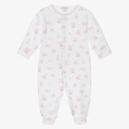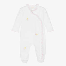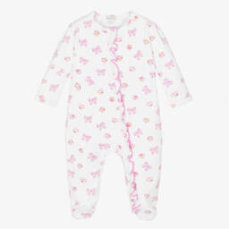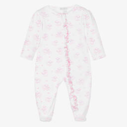 White babygrow for girls by Kissy Kissy, made in wonderfully soft Pima cotton jersey. Designed with an easy zip fastening on the front, this cute babysuit is patterned with pretty pink and red hearts and trimmed with a cute ruffle.