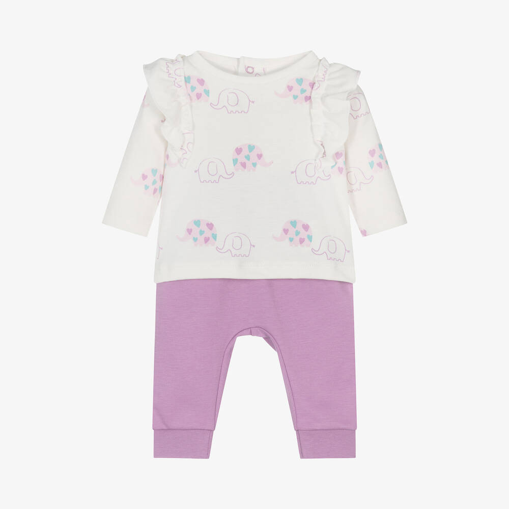 A sweet purple and ivory trouser set for baby girls by Kissy Love, made from super soft Pima cotton jersey. The long-sleeved top is printed with an adorable elephant pattern, has pretty frills on the shoulders, and fastens with poppers on the back. The simple trousers have an elasticated waist for a comfortable fit.