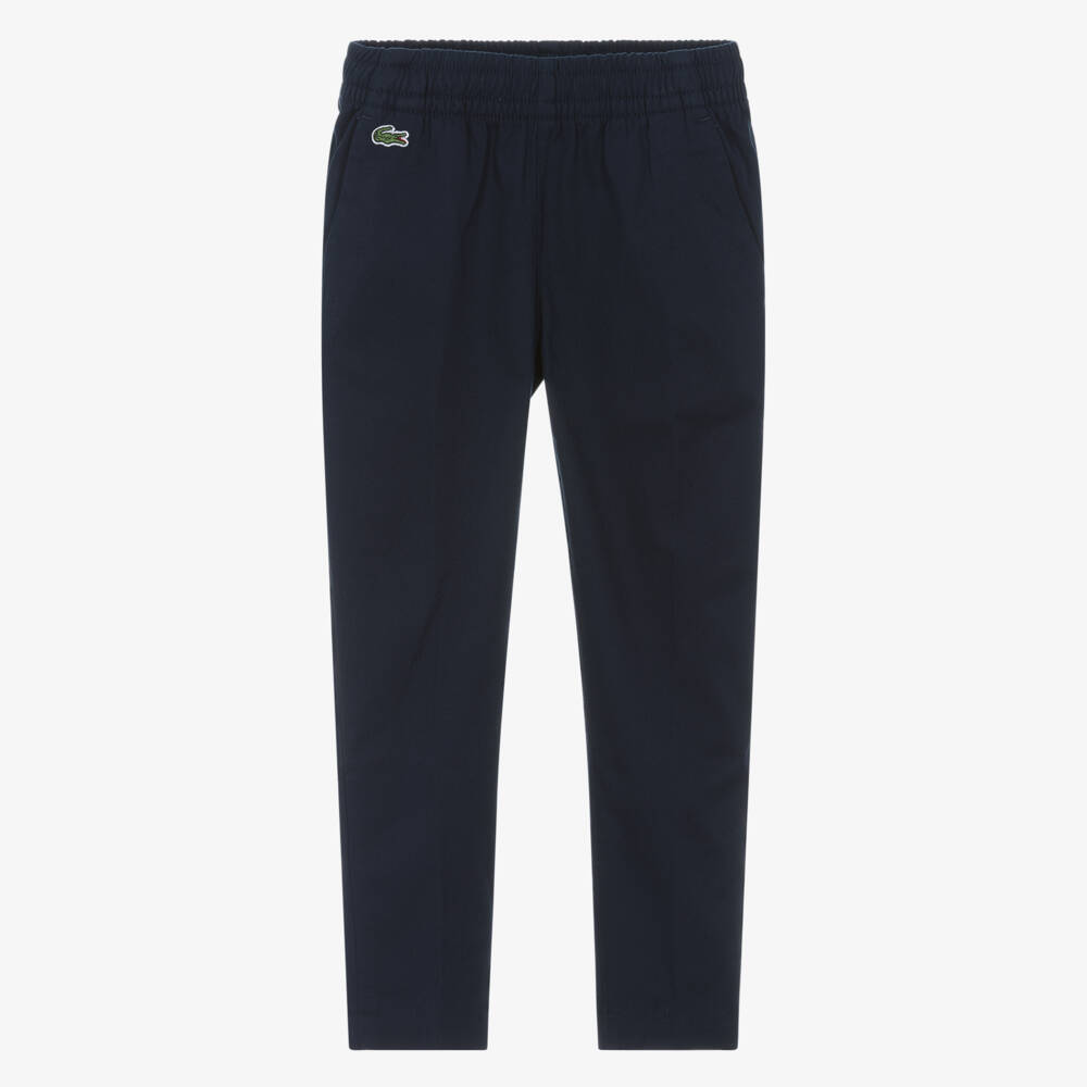 Smart-casual navy blue chino-style trousers for boys by Lacoste. They are made in comfortable cotton with a slight stretch and an easy to wear, elasticated, internal drawstring waist that gives a great fit. They have the brand's signature, embroidered green crocodile logo badge on one side.