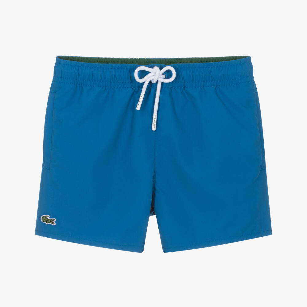 Royal blue swim shorts for boys by Lacoste, ideal for warm days by the pool or beach. Made in soft, silky, recycled fabric, they have a comfortable, drawstring waistband for a great fit and useful side pockets. A signature embroidered crocodile logo patch on one leg provides instant brand identity.