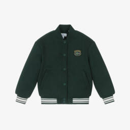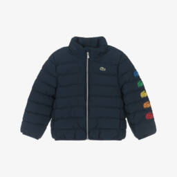 Navy blue cotton jacket for boys by Lacoste, made in soft, mid-weight sweatshirt jersey. An ideal layering piece, it has ribbed trims with contrasting blue and green stripes for a sporty look. The signature embroidered crocodile logo badge is on the chest, giving instant brand identity, and there are useful side seam pockets.
