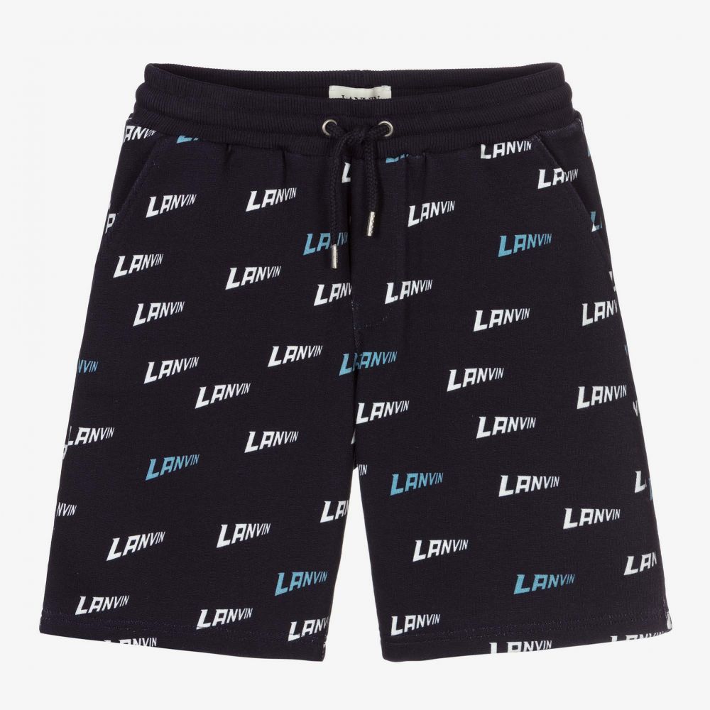 Boys Mini-me, Bermuda length shorts by luxury brand, Lanvin. Navy blue, they have a white and pale blue logo pattern. Made from soft, mid-weight sweatshirt cotton jersey, they are comfortable to wear with an elasticated drawstring waistband. There are useful side pockets and popper fastening back pockets.