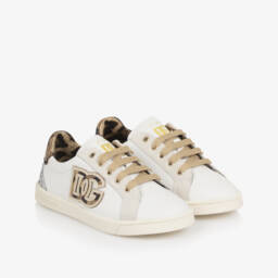 White Curb trainers for boys and girls by Lanvin, made in smooth leather with mesh trims. These stylish '90s-inspired trainers are designed with exaggerated dimensions, including a padded logo-branded tongue and metallic eyelets. They come with two pairs of oversized, woven herringbone laces, one pair green and the other beige. Styled with a rounded toe, the shoes have a comfortably padded textile lining and a leather insole, with a non-slip rubberised sole for good grip.