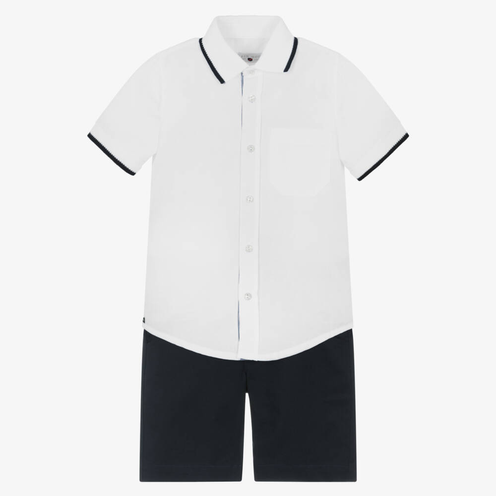 Boys smart-casual shorts set by Lapin House, in white and navy blue. The crisp white shirt has a textured, knitted collar and matching trims on the cuffs, with the button-down placket lined in blue and white stripes. It is paired with navy blue twill shorts, that have belt loops, pockets on both the front and back, and a useful adjustable waistband.