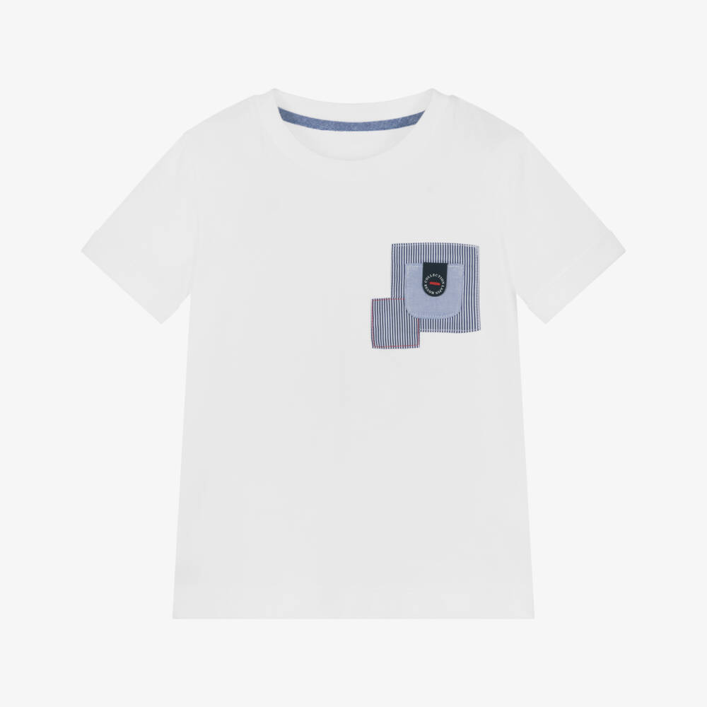 White T-shirt for boys by Lapin House, made in soft cotton jersey. Cool and comfortable, this casual top has turned-up cuffs on the short sleeves and a cute little Oxford cotton pocket on the chest with a logo tab and striped trim.