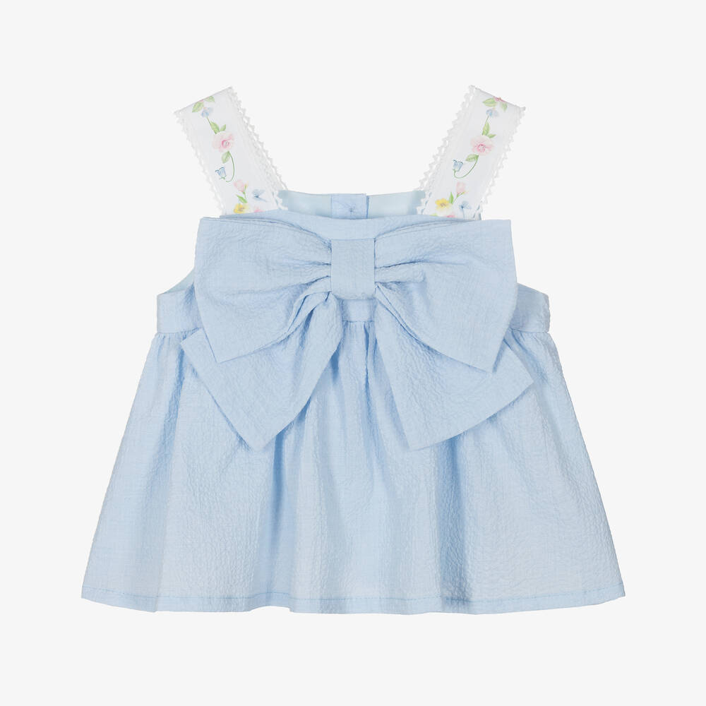 A beautiful pale blue sleeveless blouse for girls from Lapin House, made in soft cotton seersucker for warmer days. This pretty flared top has a statement bow on the front. The wide ivory straps are decorated with soft pastel-coloured floral prints and delicate lace with a hint of beaded sparkles.