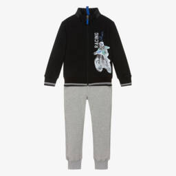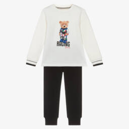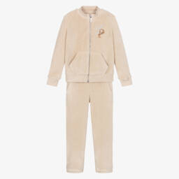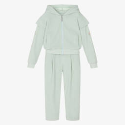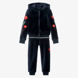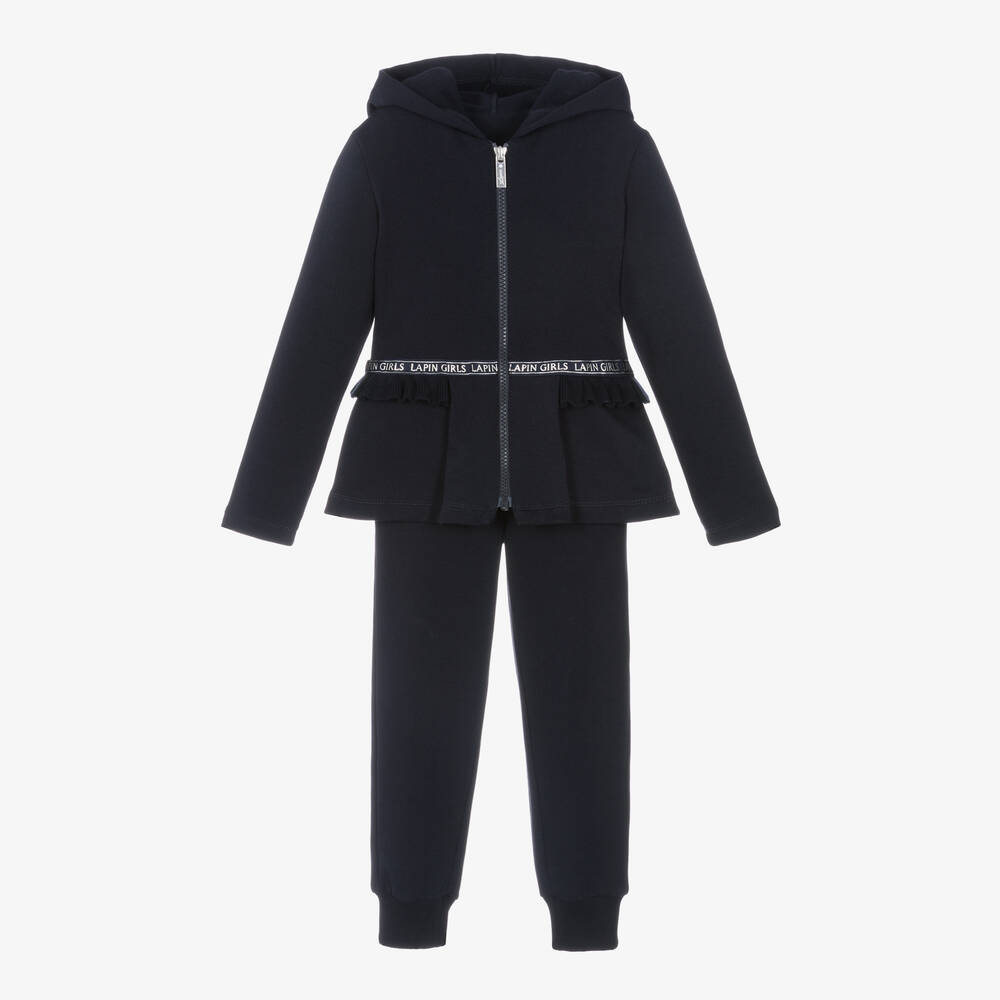 Casual yet stylish, this navy blue tracksuit for girls is by Lapin House. Cosy and comfortable, it is made in soft cotton jersey, with a warm fleecy inside. The hooded top is trimmed with a ribbed ruffle around the waist and has silver-lettered logo tape across the front. Designed with a pretty flared hem, it has a front zip fastening with a branded metal puller. The joggers have ribbed ankle cuffs, an elasticated waist for an ideal fit, and slanted pockets at the hips.