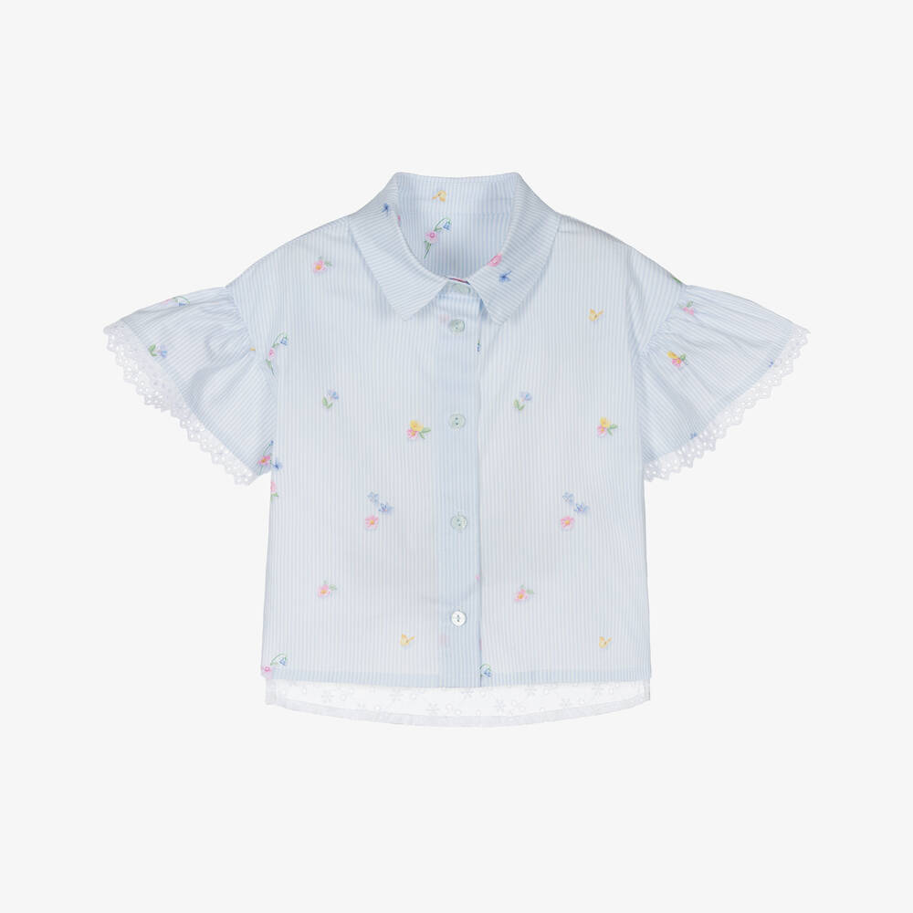 A lovely pale blue and white cotton blouse for girls by Lapin House. This pretty, boxy warm-weather design is made in stripes and floral print poplin with contrasting broderie anglaise for a unique combination. It has cute flutter sleeves with matching lace trims for a sweet finishing touch.