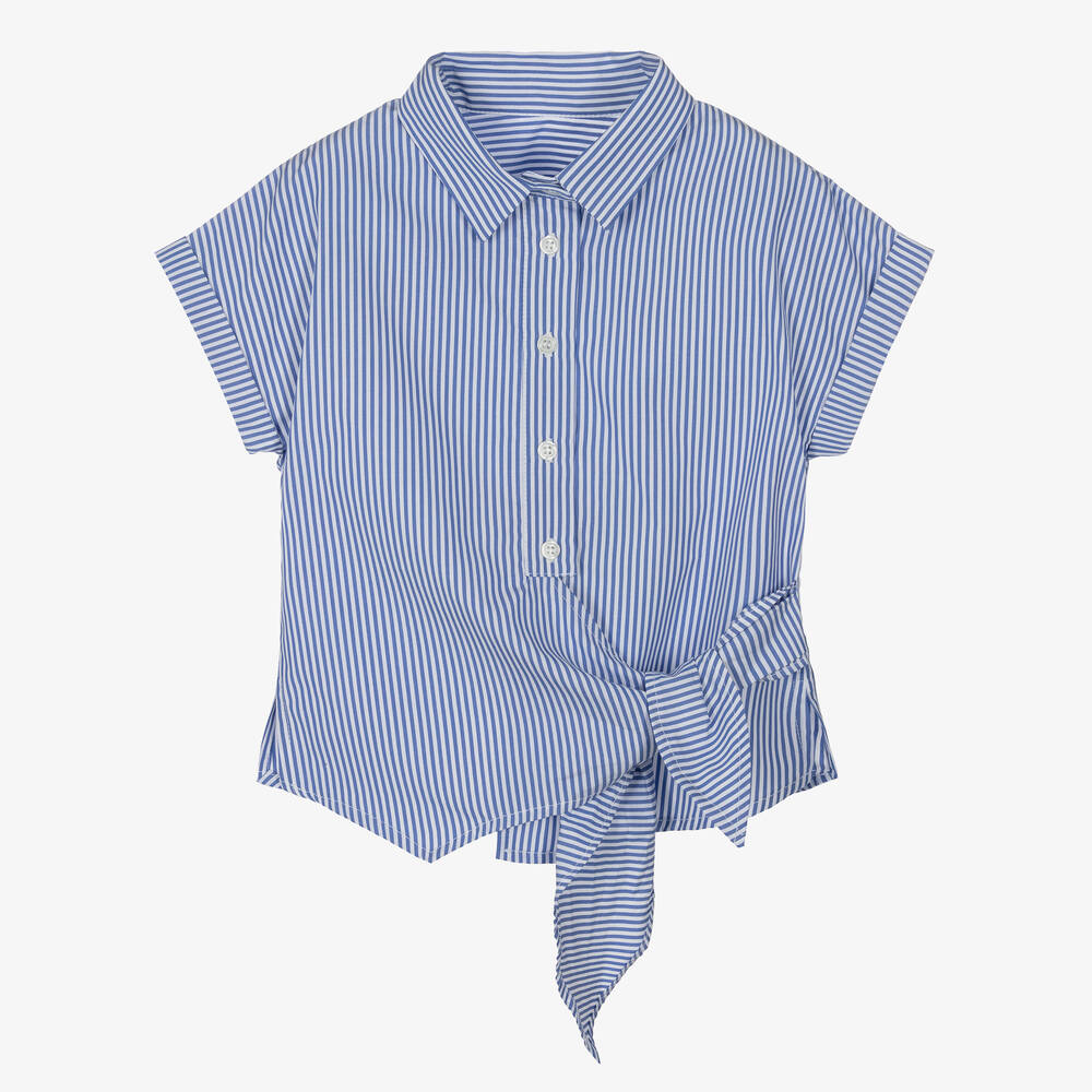 Lovely blue and white striped poplin blouse for girls by Lapin House. Soft and lightweight, it has a three-quarter button placket with ties to finish into a pretty bow on the side. It is styled in a relaxed fit with longer length and fixed turn-ups on the sleeves.