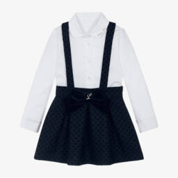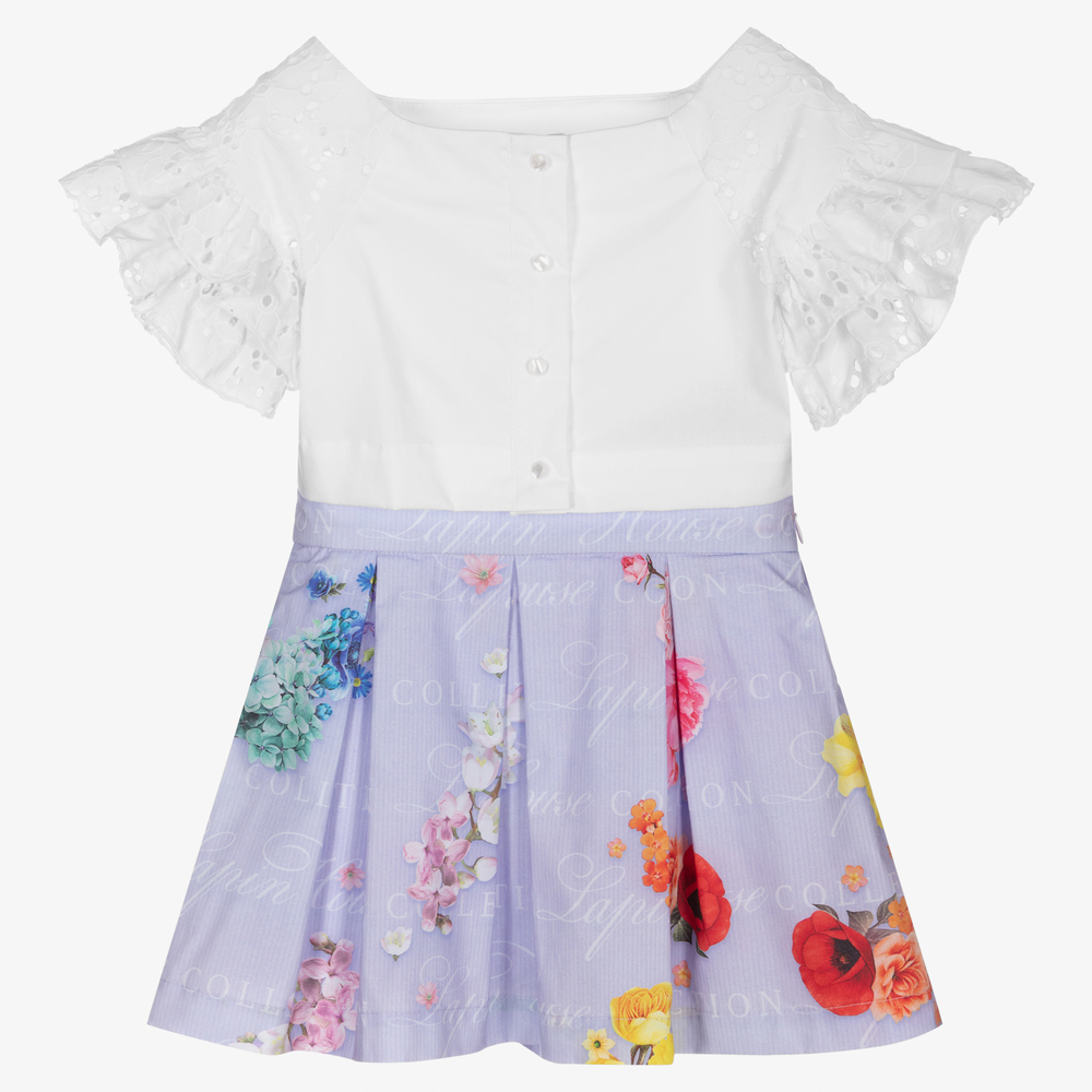Girls pretty skirt set from Lapin House. The white cotton cropped top has lovely ruffled broderie anglaise raglan sleeves and pearlised button fastenings on the back. The pleated purple skirt has faint stripes and a colourful floral pattern with white logos. It has a useful adjustable waistband and fastens with a zip on the side.
