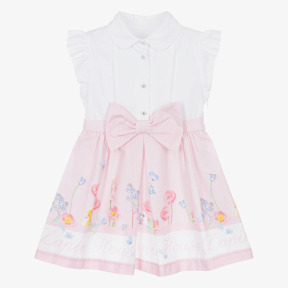 White and pink stripe cotton dress for girls by Lapin House, ideal for elevating the every day as well as wearing for special occasions. This summery poplin dress features a crisp white top with ruffles over the shoulders and button fastenings that sparkle with diamantés. The striped pink skirt has a large, fixed bow on the waist and a beautiful floral pattern with chicks and ducklings, finished with repeat logos around the hemline.