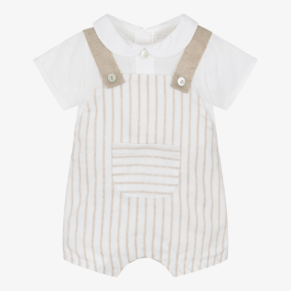 A cute cotton shortie for baby boys from Laranjinha, in beige and white. Made to look like dungaree shorts over a shirt, this sweet one-piece has popper fastenings for convenience.