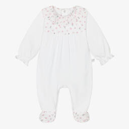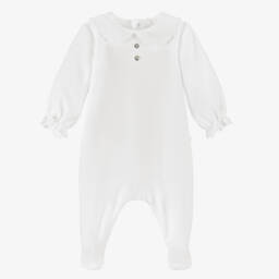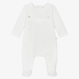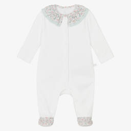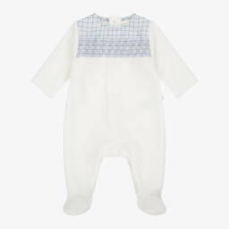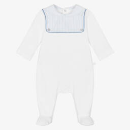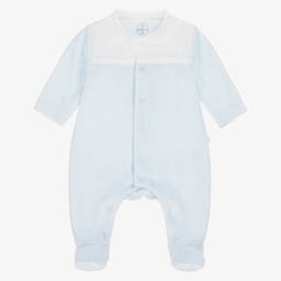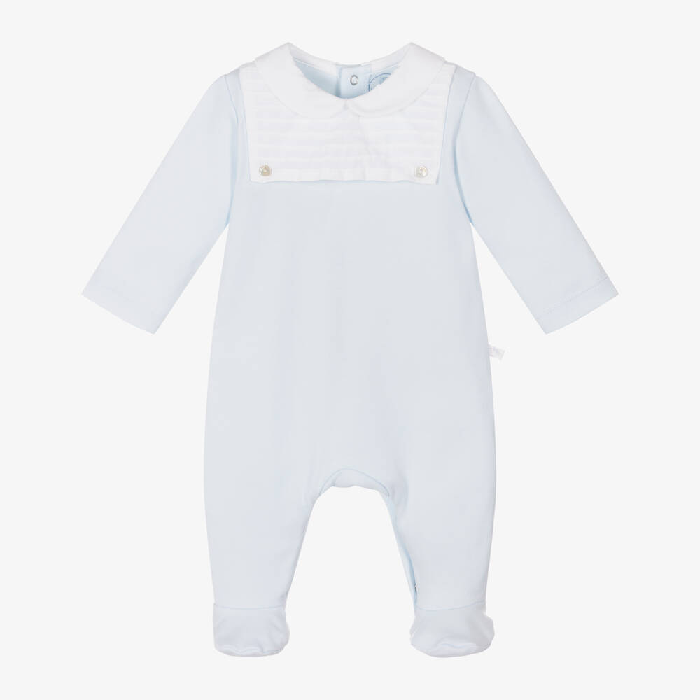 A charming pale blue cotton babygrow for boys from Laranjinha. This comfortably soft jersey one-piece has a sweet white bib finished with decorative mother-of-pearl buttons.