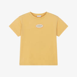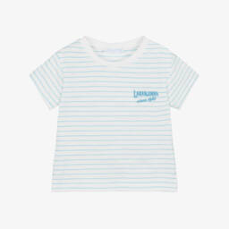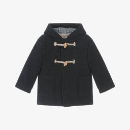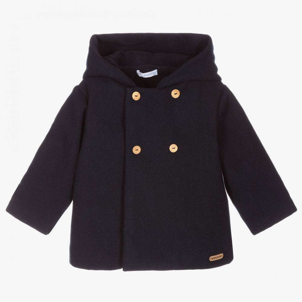Navy blue hooded coat for younger boys and girls by Laranjinha. Made in mid-weight brushed polyester with a warm fleecy lining, it fastens with wooden logo buttons. There is a logo tab by the hemline.