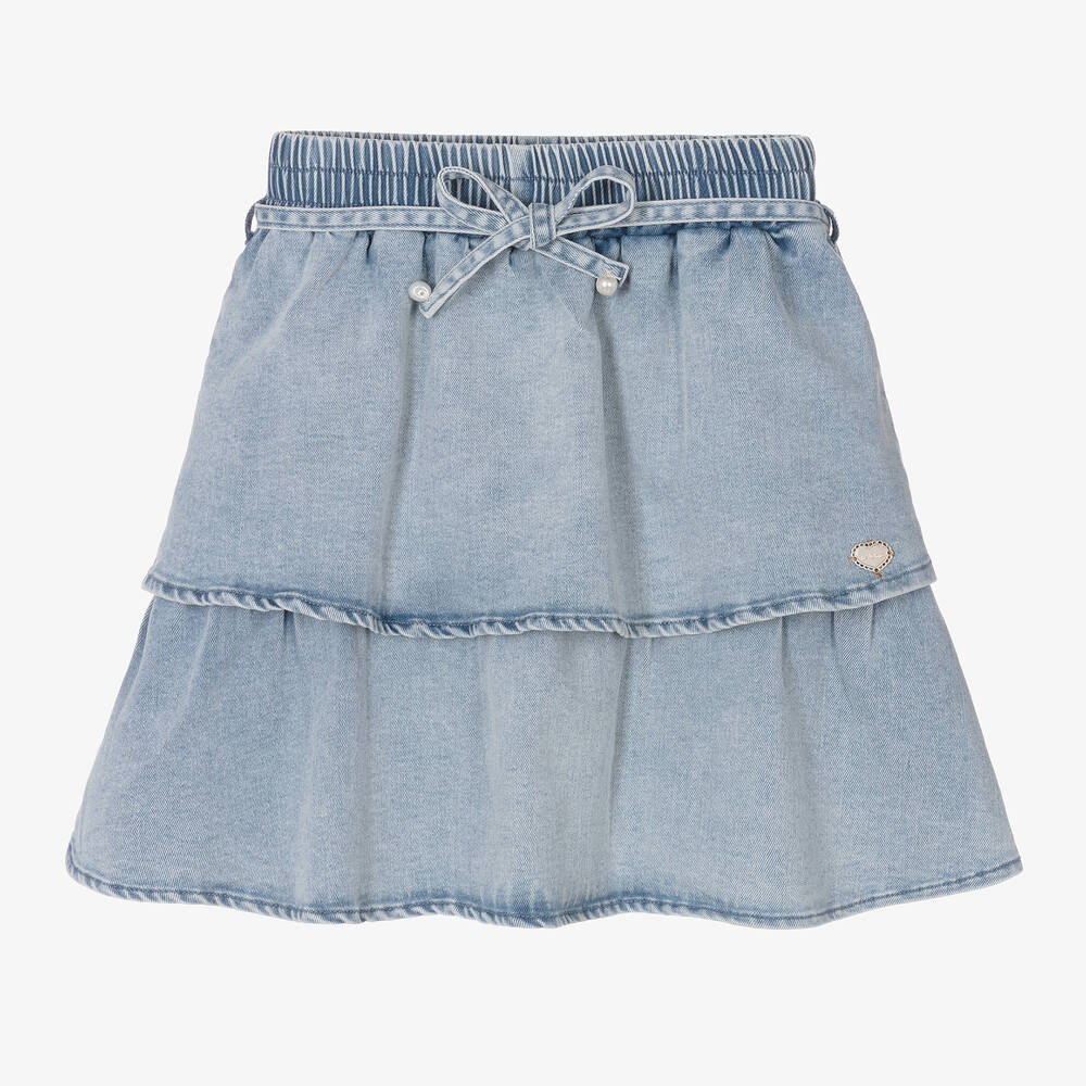 Pretty denim skirt for girls by Le Chic, in a light blue wash. This tiered style has floaty layers to form a girly silhouette. The waist is elasticated for comfort and it comes with a faux pearl trimmed tie-up belt around the waist for added styling. There is a small, gold, heart-shaped logo charm on one side for a final touch of branded glamour.