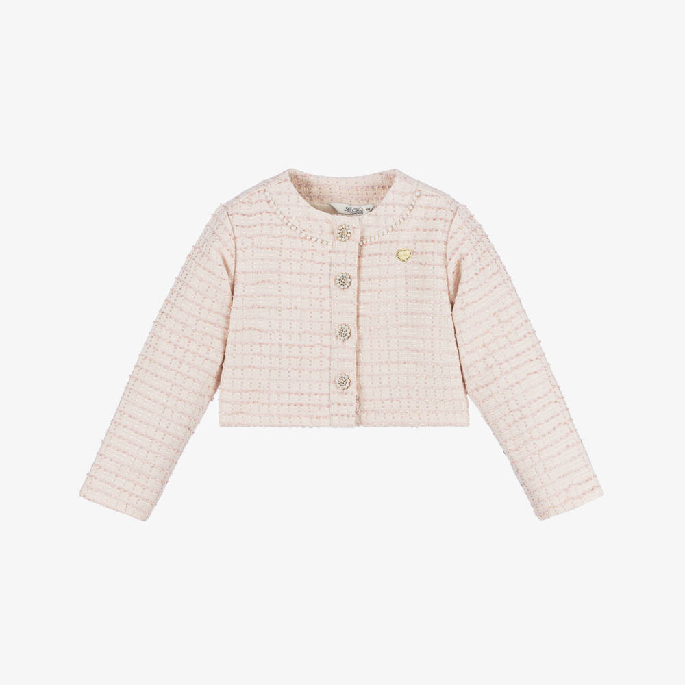 Stylish pink tweed jacket for girls by Le Chic, woven with a shimmery thread and trimmed with pearls. Ideal for smarter occasions, it has a branded gold charm on the front and a silky lining for comfort. Pearl and diamanté button fastenings add an elegant finishing touch.