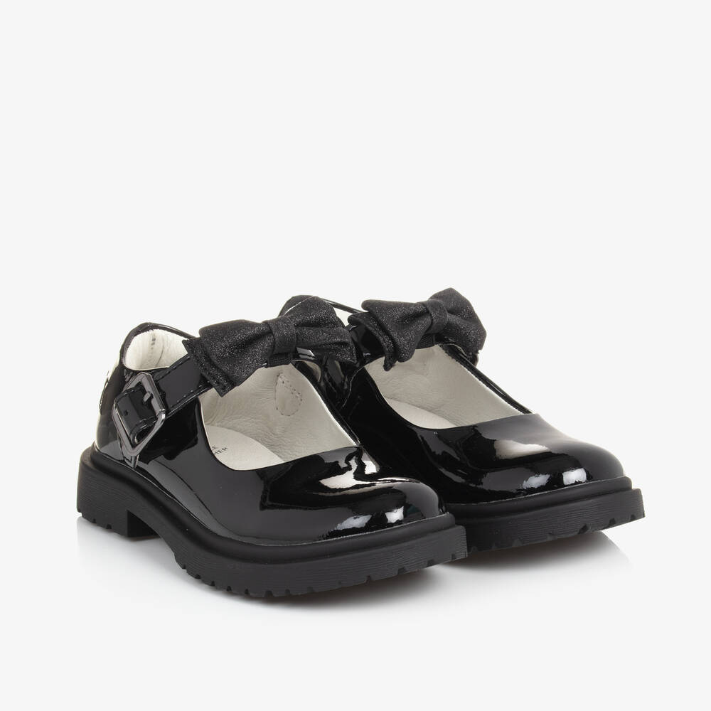 Smart black shoes for girls by Lelli Kelly, in glossy patent leather. Ideal of school and formal occasions, these comfortable shoes are lined in soft and supple leather with padding around the ankle and a lightly cushioned insole. The buckle-fastening strap has a removable, glittery bow and is adjustable for a comfortable fit. For durable wear, they have chunky non-slip rubber soles.
