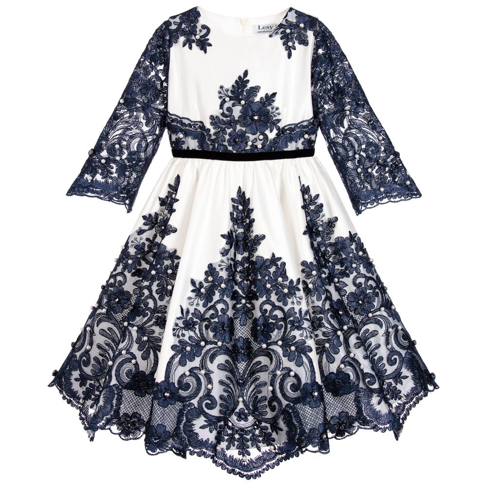 This breathtaking dress from Lesy is a lovely choice for a sophisticated girl. Navy blue embroidered lace is embellished with pearls and gemstones to stunning effect, and the fabric's soft sheen radiates Florentine sophistication.