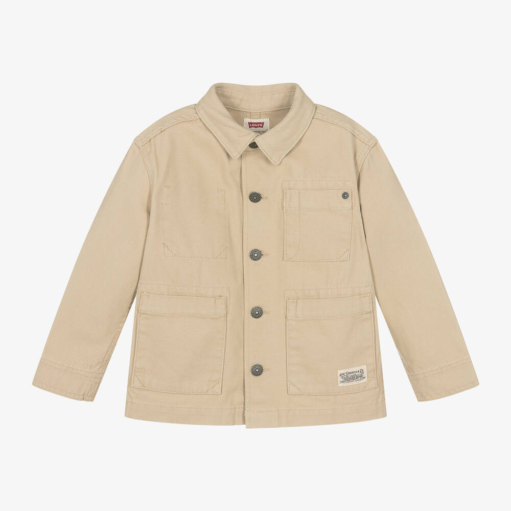 Cool beige cotton canvas jacket for boys by Ralph Lauren. Designed in a French workwear style, it features a pointed collar, three exterior slip pockets and an inner pocket. Soft and durable, it simply buttons up on the front and cuffs. Antiqued dark silver jeans buttons and rivet, a 2-horse logo patch infuses Levi's denim vibe to this stylish jacket.