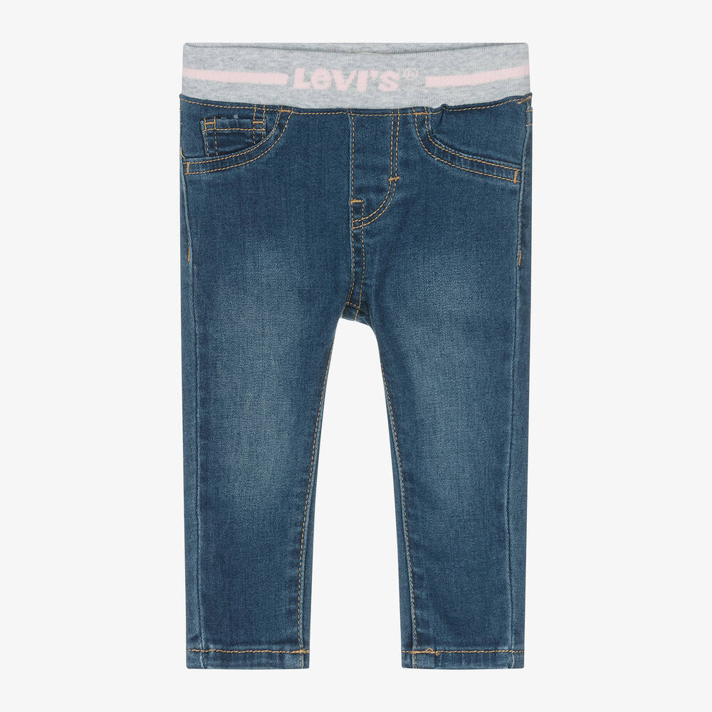In a mid-blue wash with faded patches, these skinny fit denim jeans for little girls are by Levi's. They are made in soft cotton with added stretch for comfort, with an elasticated ribbed waistband for easy pull on. For a designer touch, the brand's pink logo can be seen on the grey waistband, with their iconic Red Tab stitched on the back.