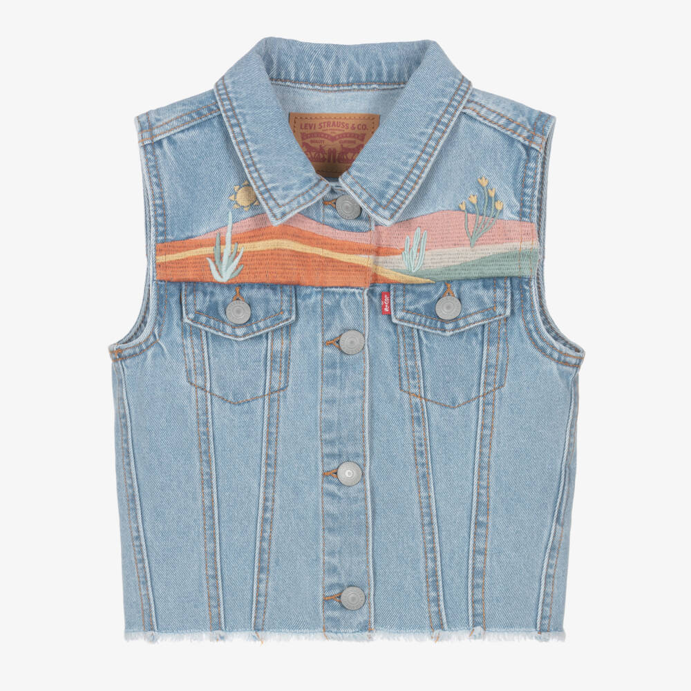 Effortlessly cool, this washed blue denim Levi's vest for girls has a gorgeous, embroidered desert scene across the chest. Fastening with branded buttons, the sleeveless jacket has signature design details, including buttoned chest pockets, shaping on the front and a frayed hem. The distinctive Red Tab adds a designer touch.