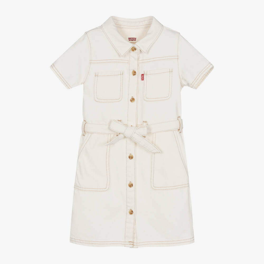 A casual ivory denim dress for girls by Levi's. Made in non-stretch cotton denim, it has a pointed collar, short sleeves and branded front button fastenings. Utility style, there are two patch pockets on the bodice, with two larger pockets on the skirt. This cool dress comes with a detachable sash belt and has the iconic Red Tab sewn on the chest.