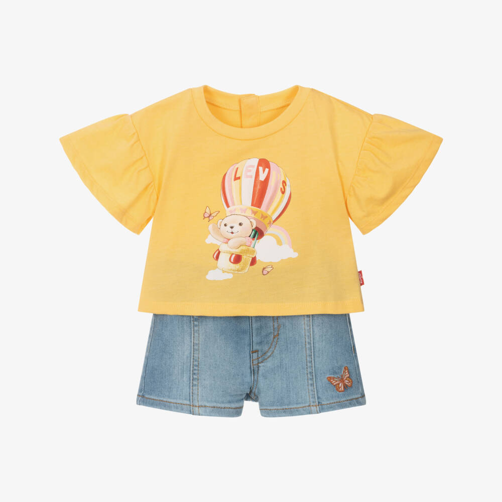 A sweet and casual denim shorts sets for little girls from Levi's. The yellow jersey tee has a cute teddy bear in a hot air balloon on the front. The blue denim short have an embroidered butterfly on the front and the iconic Red Tab on the back pocket.