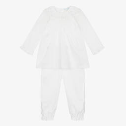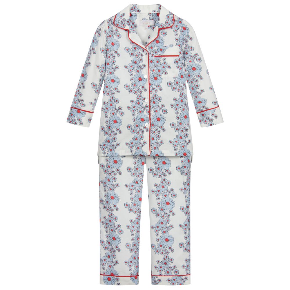 Girl's pretty white cotton Mini-me pyjamas by LiTTLE YOLKE, with a delicate blue and red blossom print, exclusive to the brand. Inspired by the adult line, they are soft and lightweight with red grosgrain ribbon trims. Classically styled, they have a small front pocket and a comfortable drawstring waist.