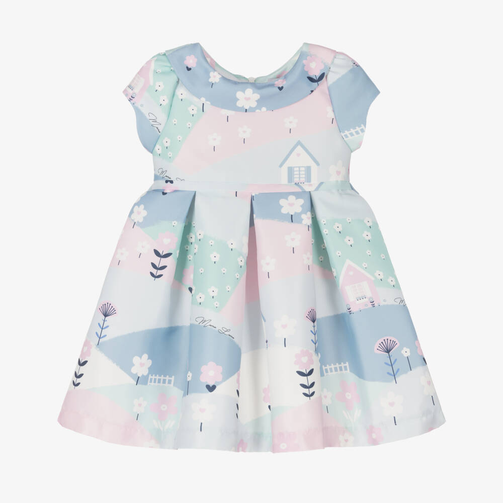 A charming special occasion dress for little girls by Mama Luma, in pastel shades of blue, pink and green. Handmade in lustrous satin with a beautiful landscape print, it has an elegant collar, capped sleeves and a pleated skirt for a classic silhouette. The dress has a comfortable voile lining and fastens with a neat, concealed zip.