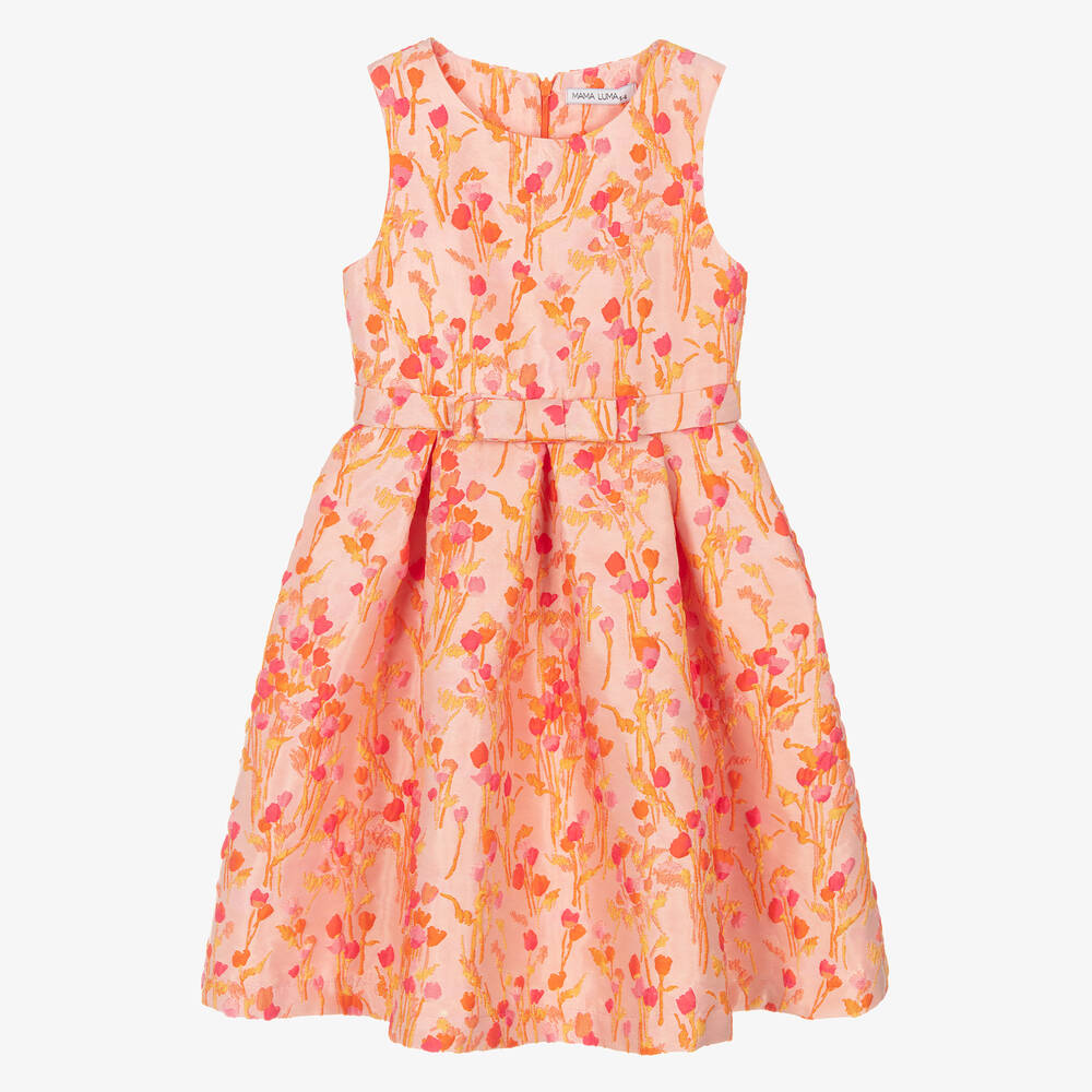 Beautiful pink special occasion dress for girls by American brand Mama Luma. Handmade in gorgeous satin jacquard with pink and orange flowers, it has a fixed waistband with a neat, central bow and a full, box-pleated skirt. The dress is fully lined in orange cotton voile for comfort and fastens with a discreet, concealed zip around the back.