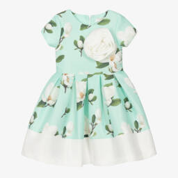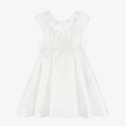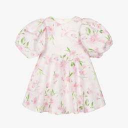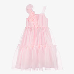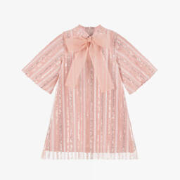 A stylish pink dress for girls by Mama Luma, handmade in soft satin twill. Elegantly styled with a pretty flared hemline, this special occasion dress has a sparkling silver bows on the front, with a matching trim around the neckline. It has a lightweight voile lining for comfort and fastens with a concealed zip on the back.