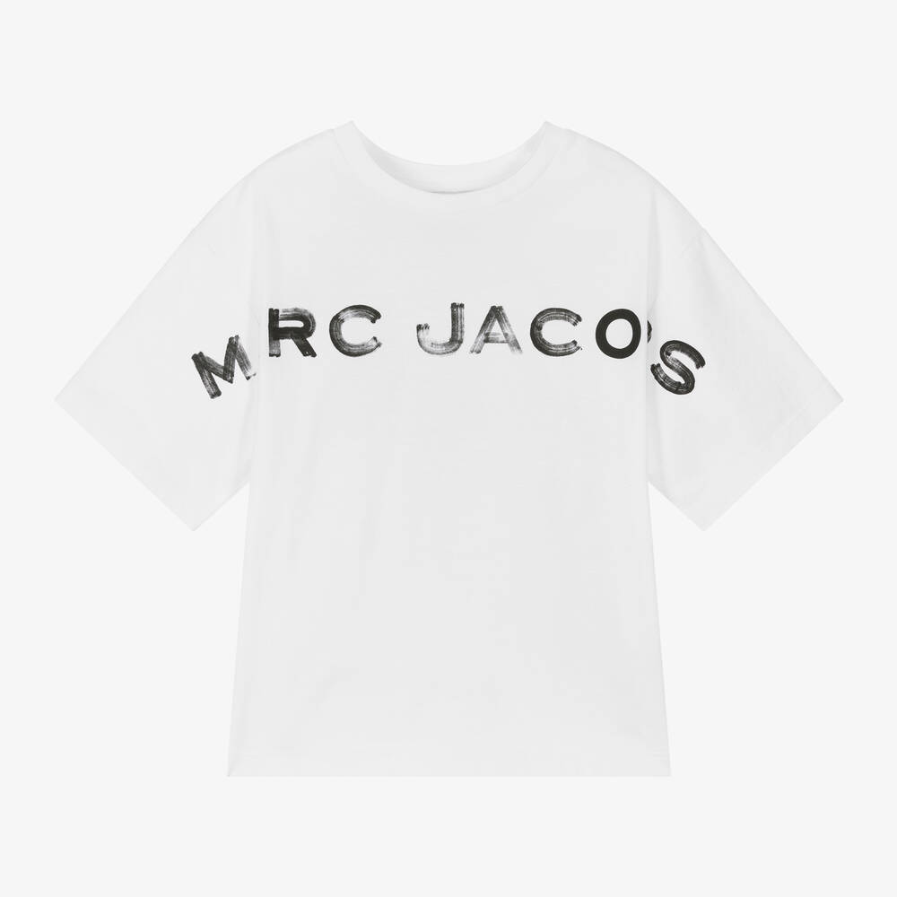 White cotton t-shirt for boys by MARC JACOBS, with a painted-effect, black logo on the front and an abstract black print appliquéd on the back. It is made in comfortable jersey, ideal for adding a designer touch to the casual wardrobe.