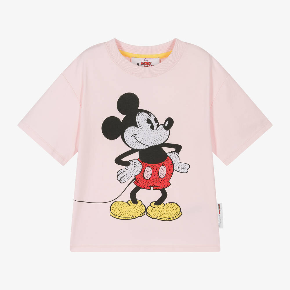 Pale pink T-shirt for girls by MARC JACOBS, made in soft cotton jersey with a relaxed fit and dropped shoulders. This fun tee has a colourful Mickey Mouse motif on the front trimmed with sparkly rhinestones. There are further logo and Mickey-themed prints and labels on the back and side.