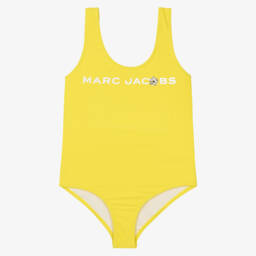 White swimsuit for girls by MARC JACOBS, with red trims and a full lining. Silky and stretchy, this fun piece has a colourful Mickey Mouse motif on the front trimmed with sparkly diamantés. The low cut back has an elasticated strap across the middle, with a black logo print and Mickey Mouse motif underneath.