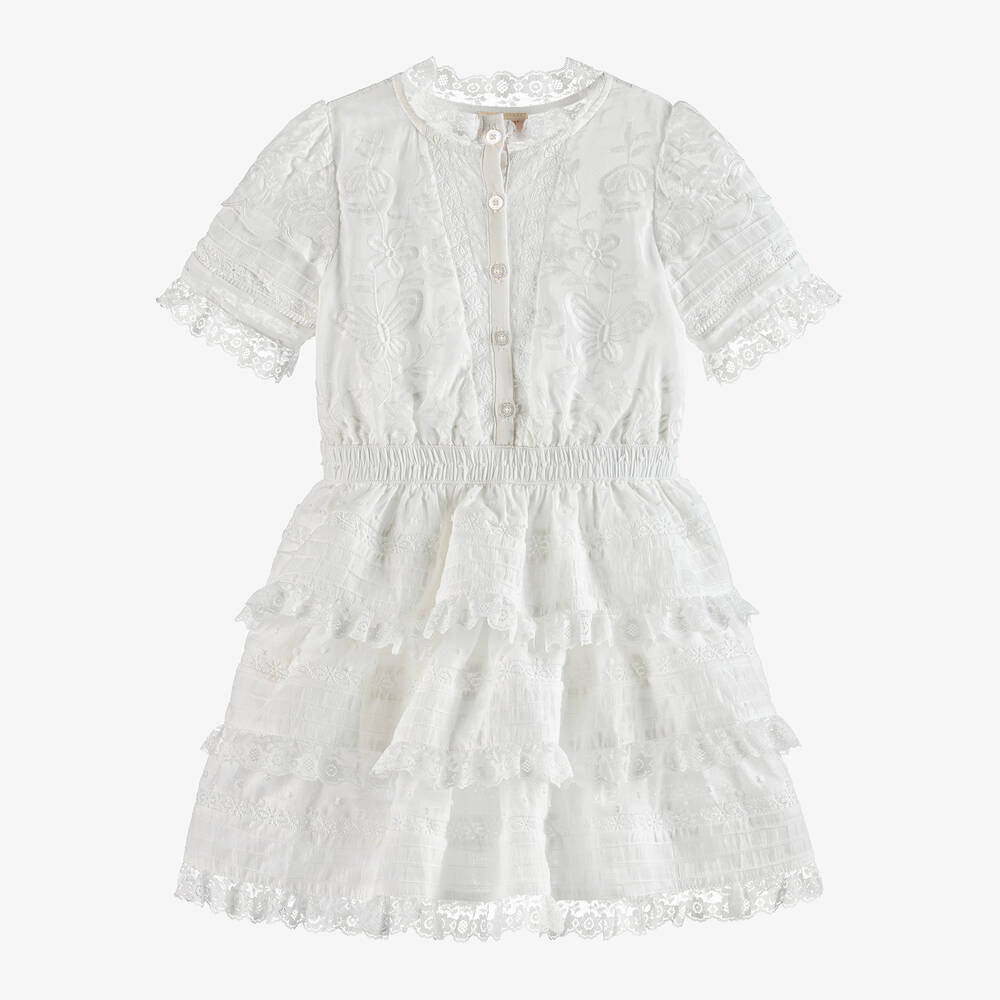 A lovely ivory dress for girls by Marlo Kids, made in beautifully soft and lightweight cotton with sheer silk panels on the bodice and sleeves. For casual gatherings or more special occasions, this feminine dress is embroidered on the bodice with tonal flowers and butterflies. Delicate lace adds detail to the neckline and cuffs and simple buttons fasten on the front. The short sleeves have ladder and scallop trims for contrast and gently gather on the shoulder for a fuller look. The waistline is comfortably elasticated and the layered, frilly skirt is woven with alternative stripe and plumeti finishes.
