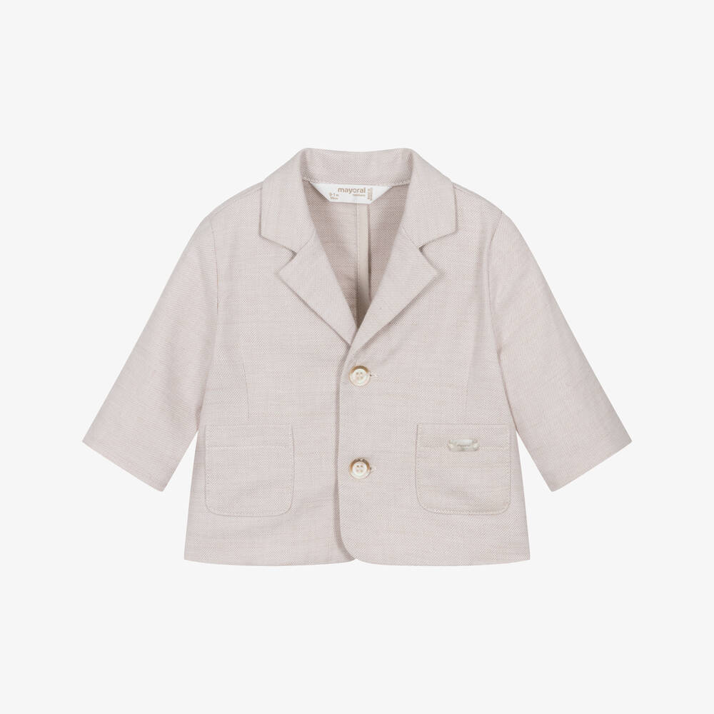 Smart-casual beige blazer for baby boys by Mayoral, woven in a lightweight cotton and linen blend. It is vented on the back for ease of movement and fastens with buttons on the front. There are two patch pockets, one trimmed with a branded plate.