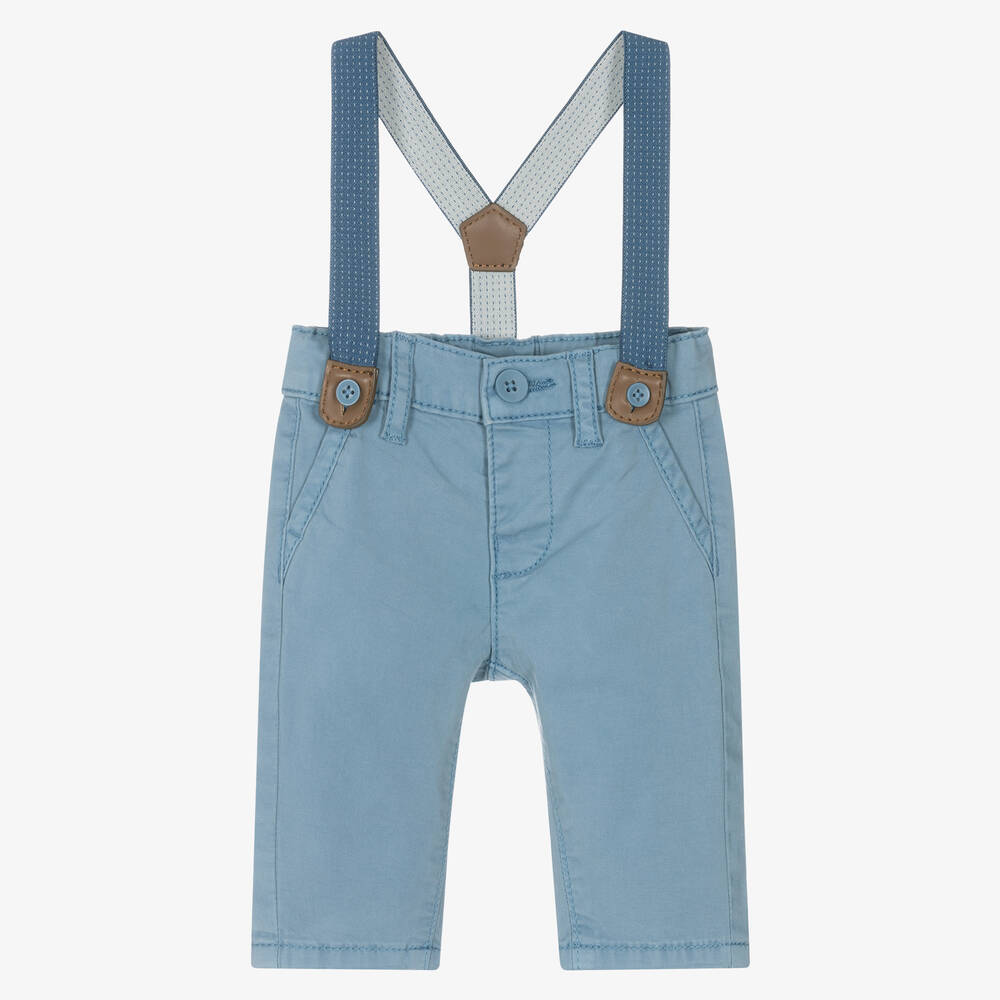 Blue cotton trousers for baby boys by Mayoral, made in soft twill with a slight stretch for comfort. Designed in a chino style with faux front and back pockets, they fasten with a button and have an adjustable waist. They come with blue elasticated braces that attach with buttons.