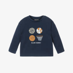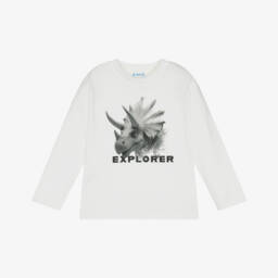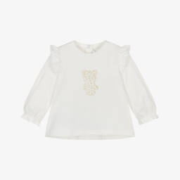 A sweet white top for baby girls by Mayoral, made in soft cotton jersey. The front is printed with a beige teddy, hearts and round shapes, edged in gold glitter for added sparkle. There is a gathered hem at the back, with poppers for easy fastening.