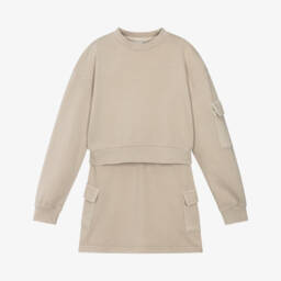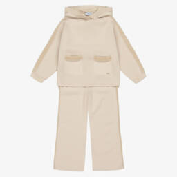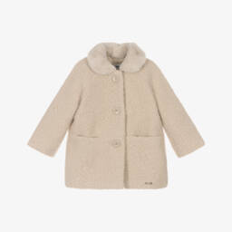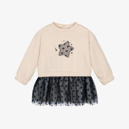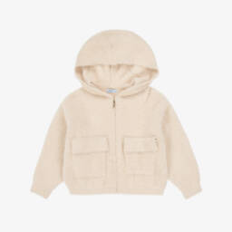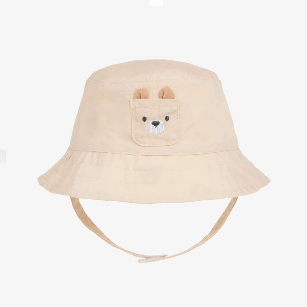 A beige and white reversible cotton sun hat for baby boys and girls by Mayoral, for an adorable two looks in one. In a cute bear theme, the plain beige side has a pocket appliqué while the white side has an all-over print. The useful chin ties can be threaded through and used on both sides.