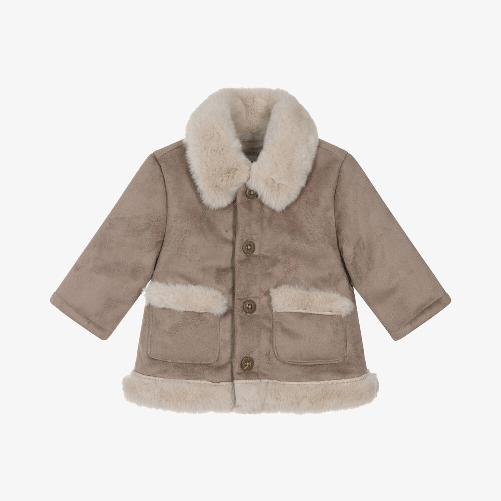 Adorable light brown faux suede coat for baby boys and girls by Mayoral. Both stylish and warm, it is trimmed and fully lined in super soft, ivory faux fur, with two patch pockets on the front. It fastens with wooden buttons on the front.
