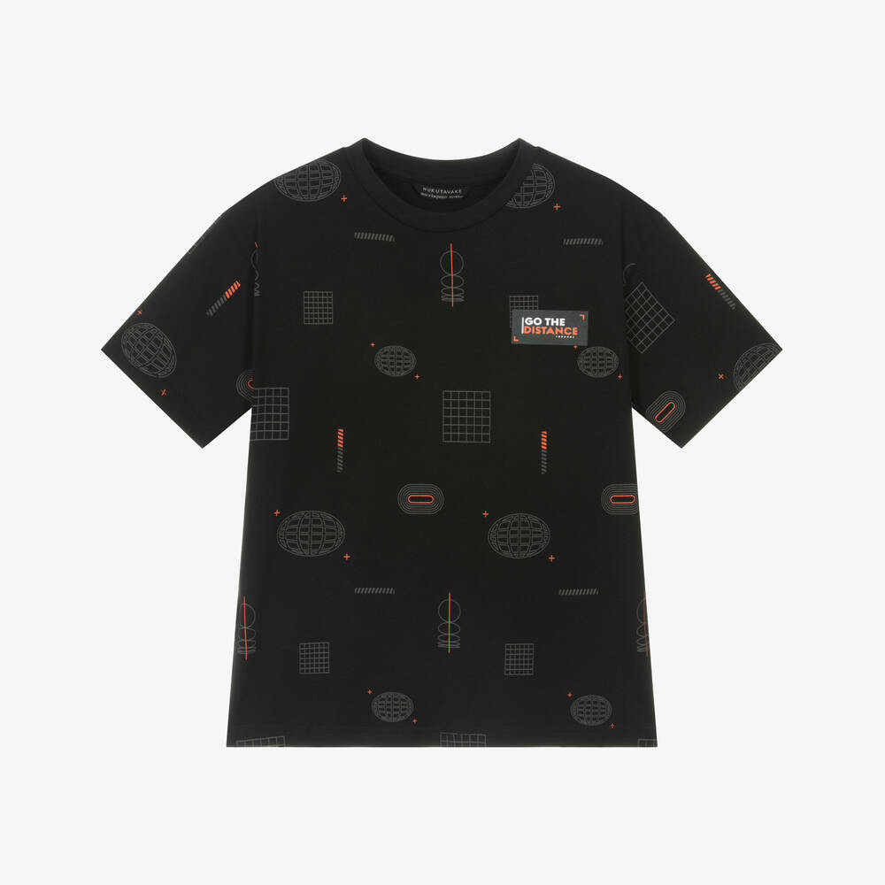 Black cotton T-shirt for older boys by Mayoral Nukutavake, made in comfortable jersey. This short-sleeved tee has a red and grey graphic design with 'Go The Distance' printed on the chest.