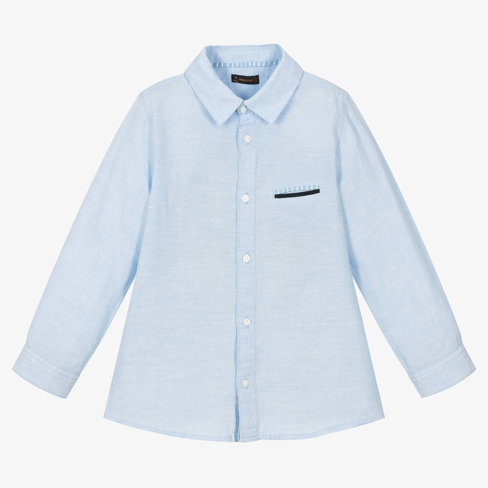 Smart-casual pale blue shirt for boys by Mayoral, with blue and white stripe trims. Cool and comfortable to wear, it is made in a soft cotton and linen blend. There are branded button fastenings, with a concealed chest pocket and logo tab on the button placket.