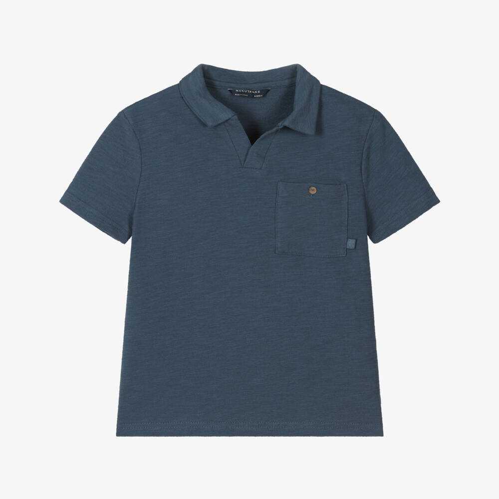 Midnight blue polo shirt for older boys by Mayoral Nukutavake, made in textured cotton jersey. This casual style has an open neckline and a small chest pocket with a button fastening.