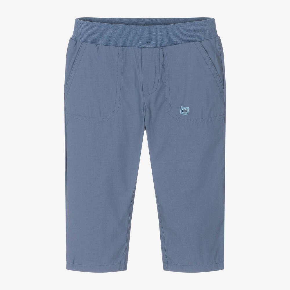 Little boys mid-blue trousers by Mayoral, made from a soft cotton blend. Comfortable to wear, these regular-fit trousers are jersey lined and have an adjustable waistband for a great fit. The front and back pockets add a smart touch.