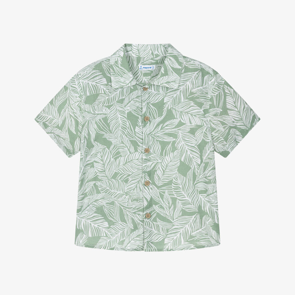 Green and white shirt for boys by Mayoral, patterned in a tropical palm leaf print. Made in a soft cotton and viscose blend with a lightweight linen feel, it fastens with wooden buttons down the front.